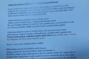 Dosyada, Yunus Durmaz'ın, Ankara Gar saldırısı sonrası örgüte verdiği 3 sayfalık rapor yer aldı. Raporda, Durmaz, saldırı öncesi 5 kez izin istediğini belirterek, "Bu ayın birinden itibaren bu ameli 5 kez yapalım diye cevap istedim, cevap ayın dokuzunda Ebu Talha'yla geldi. Ben de aceleyle tertip yaptım" diye anlatılıyor. Durmaz, patlamada kullanılacak araç için para istediğini, ancak para gelmemesi üzerine kendi imkanlarıyla çözüm bulduğunu belirtiyor.