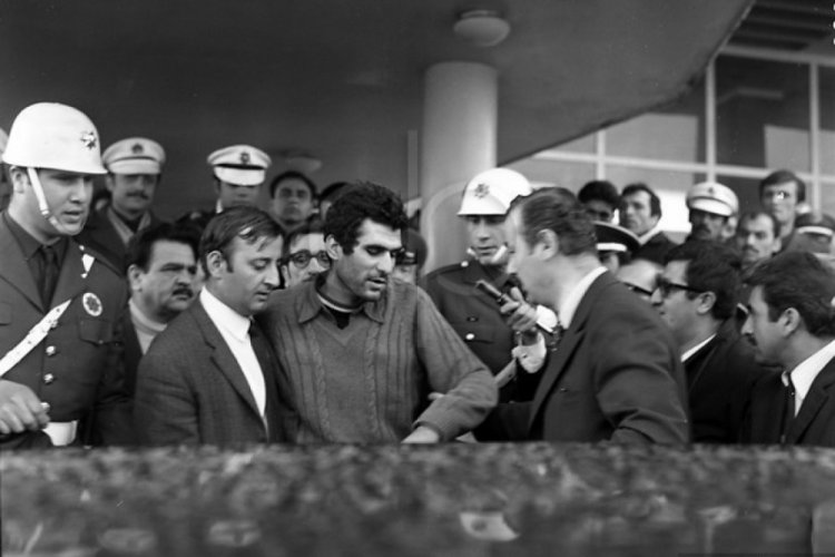 Depo Photos'un yayınladığı fotoğraflarda Deniz Gezmiş'in Ankara Emniyet Müdürlüğü'ndeki sorgusu sonrası güvenlik çemberi içinde adliyeye götürüldüğü görülüyor.