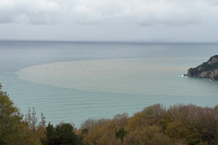 Bartın'da, 2 gündür etkili olan yağmurun ardından Bartın Irmağı'nın taşıdığı çamurlu su ile denizin rengi kahverengiye döndü.