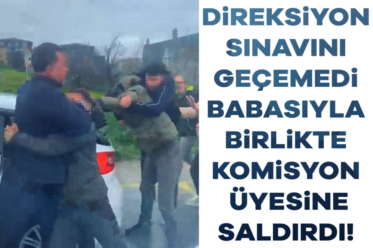 Silivri'de direksiyon sınavını geçemeyen sürücü, babası ile birlikte görevli komisyon üyesine saldırdı. O anlar kameraya yansıdı.
