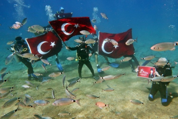 Denizin dibinde açılan Türk bayrakları ile yüzen dalgıçlar balıklar ile ilginç görüntüler oluşturdu. Dalış Okulu eğitmeni Önder Diktaş, her yıl Cumhuriyet'in kuruluşunu deniz dibinde farklı gösteriler yaparak kutladıklarını söyledi.
