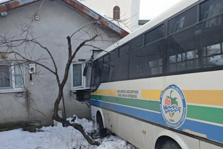 Zonguldak'ın Ereğli ilçesinde, rampa aşağı inerken kontrolden çıkan halk otobüsü yolun kenarındaki tek katlı eve çarparak durabildi. Evin ve otobüsün boş olması olası bir facianın önüne geçti.