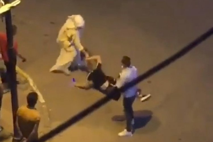Görüntülerde iki kadının kavga ettiği ve bir kadının diğerini saçından tutarak yere savurduğu görülüyor.