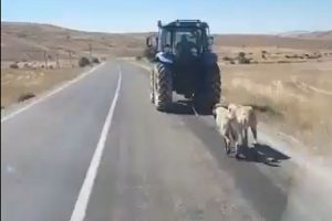 Sivas'ın Kangal ilçesi Çetinkaya Külekli köyü yakınların yaşanan olayda kimliği bilinmeyen bir sürücü 2 kangal köpeğini traktörün arkasına bağlayarak kilometrelerce sürükledi.