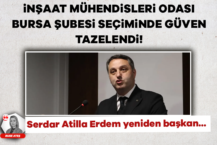 TMMOB İnşaat Mühendisleri Odası Bursa Şubesi'nde yeni dönem başkanlık seçimleri tamamlandı. Mevcut başkan Serdar Atilla Erdem ile Ferdi Tercanlıoğlu'nun yarıştığı seçimde kazanan Serdar Atilla Erdem oldu. Erdem, "Ne olursa olsun şubemiz kazansın dedik" diyerek birlik mesajı verdi.