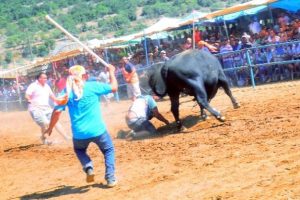 Muğla'nın Menteşe ilçesine bağlı Akkaya Mahallesi'nde bu yıl 16'ncısı düzenlenen boğa güreşlerinde, kızgın boğa sahibini hastanelik etti. Güreşlerde seyirci ile güreş alanı arasında alınan önlemler nedeniyle rakiplerinden kaçan boğalar saha içinde etkisiz hale getirilerek, olası facialar önlendi.