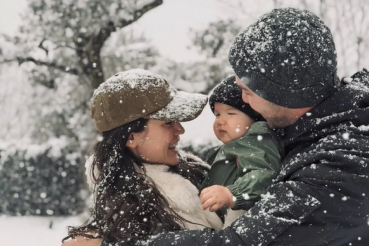 Oyuncu Kaan Yıldırım ve Pınar Deniz, 2026'nın karlı ilk gününde oğulları Fikret Hakan ile evlerinin bahçelerinde poz verdi.