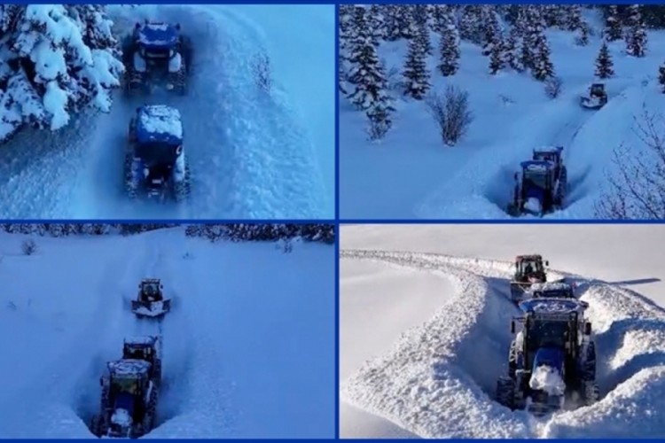 Sezer, arka arkaya bağladığı traktörlerle karlı yolları açarken çektiği görüntüleri sosyal medyasında paylaştı.