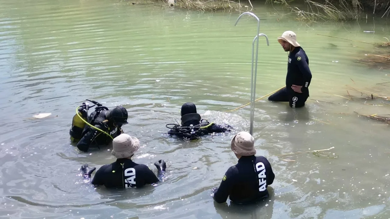 Şelalenin aktığı Berdan Baraj Gölü, dalgıçlar ve botlarla inceleniyor. Dron destekli çalışmada, baraj kıyısı ve 82 Evler Mahallesi'nde de araştırma yapılıyor.