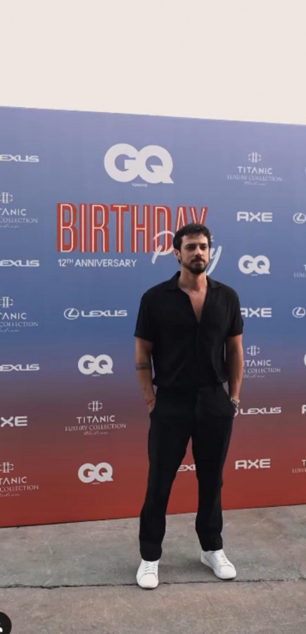 GQ Türkiye12. yıl kutlaması yemeğinde görüntülenen Kızıl Goncalar'ın Cüneyd'i Mert Yazıcıoğlu siyah gömlek-pantolon ve beyaz spor ayakkabı kombiniyle dikkat çekti.