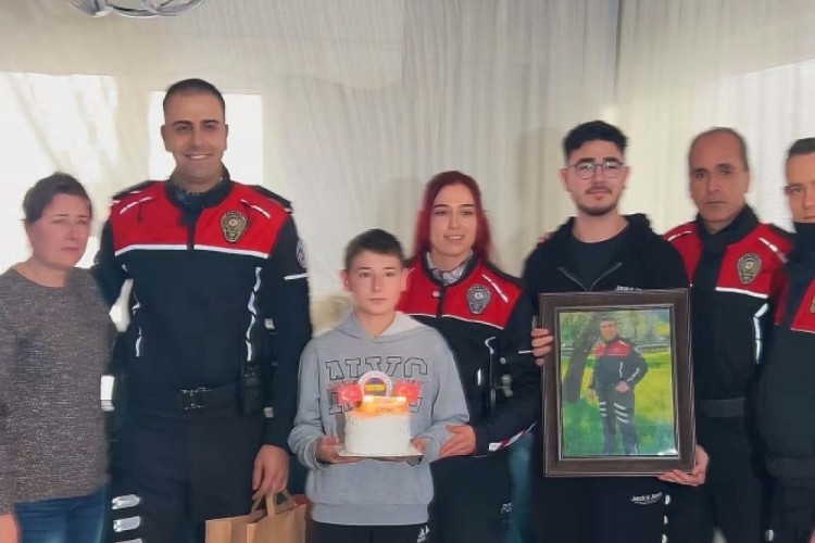 Aydın'da 'Yunus' olarak bilinen motosikletli polis timleri, geçen 29 Temmuz'da hayatını kaybeden mesai arkadaşları Ersin Cıstak'ın oğlu Enes Cıstak (13) için sürpriz doğum günü kutlaması yaptı.