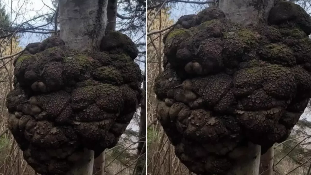Ağacın bakteri, mantar veya fiziksel yaralanmalara karşı kendini korumak için hücrelerini kontrolsüzce büyütmesiyle oluşan bu kütle, Araklı'da bulunan bu örnekte devasa boyutlara ulaşmış durumda.