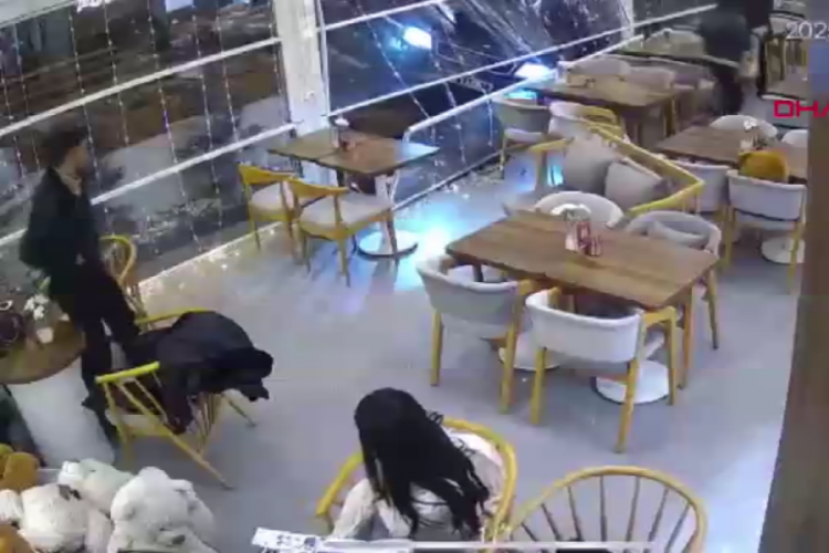 Öte yandan kaza, iş yerinin güvenlik kamerasına yansıdı. Görüntülerde otomobilin kafeye girdiği ve oturmak üzere olan 2 kişinin kazayı son anda atlattıkları görüldü.