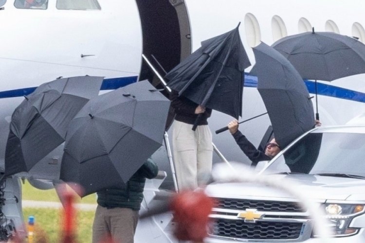 Taylor Swift, özel jetle New Jersey'deki Morristown Havalimanı'na indikten sonra etrafını güvenlik ekibi sardı. Ünlü şarkıcı, uçaktan şemsiye duvarı örülerek indi.