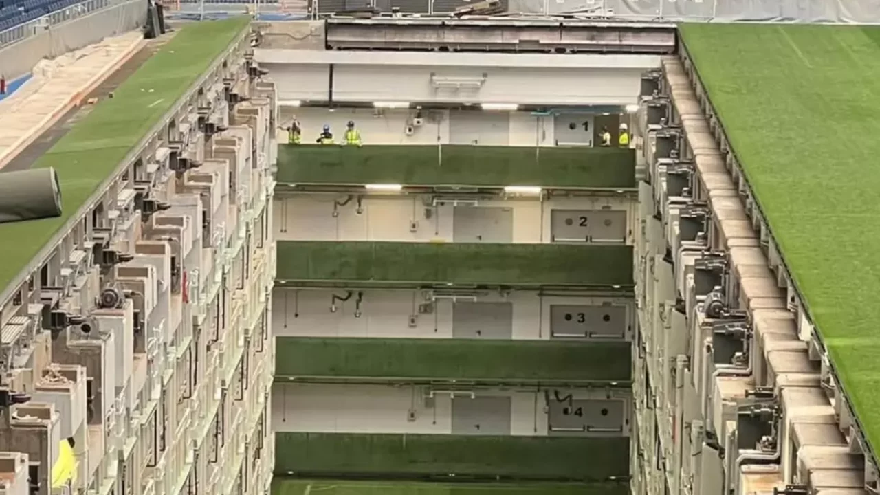 Real Madrid'in evi Santiago Bernabéu'da kurulan yaklaşık 44 milyon euroluk yeni zemin altyapısı, sahayı yer altına çekilebilen ve yıl boyu yüksek kalite sunan son teknoloji bir sisteme dönüştürdü.