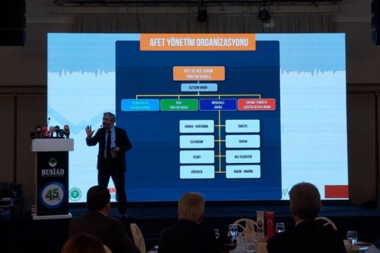 BUSİAD'ın düzenlediği iftar yemeğinde sunum gerçekleştiren Kocaeli Üniversitesi Mühendislik Fakültesi Jeofizik Mühendisliği Öğretim Üyesi Prof. Dr. Şerif Barış, 'Bursa'nın Güncel Deprem Riski' temasıyla Bursa'nın olası bir depremde yaşanabilecek sorunlarını ve alınan önlemleri paylaştı.