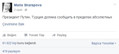 Facebook hesabından düşen Rus uçağıyla ilgili açıklamada bulunan Sharapova, "Başkan Putin, Türklere hadlerini mutlaka bildirmeli" şeklinde bir yorumda bulundu.