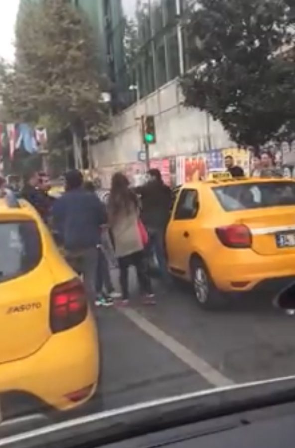 Osmanbey'de işlek bir caddede 2 taksi şoförü, yol ortasında araçlarını durdurarak yolcu alma nedeniyle tekme ve yumruklarla birbirine girdi. Kavga anı ise cep telefonu kamerasına yansıdı.