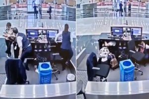 Güvenlik kameralarına da yansıyan olayda deprem olduğunu anlayınca kadın yolcuyu da yanına alarak uçuş işlemlerinin yapıldığı bankonun altına giren THY görevlisi, büyük takdir topladı.