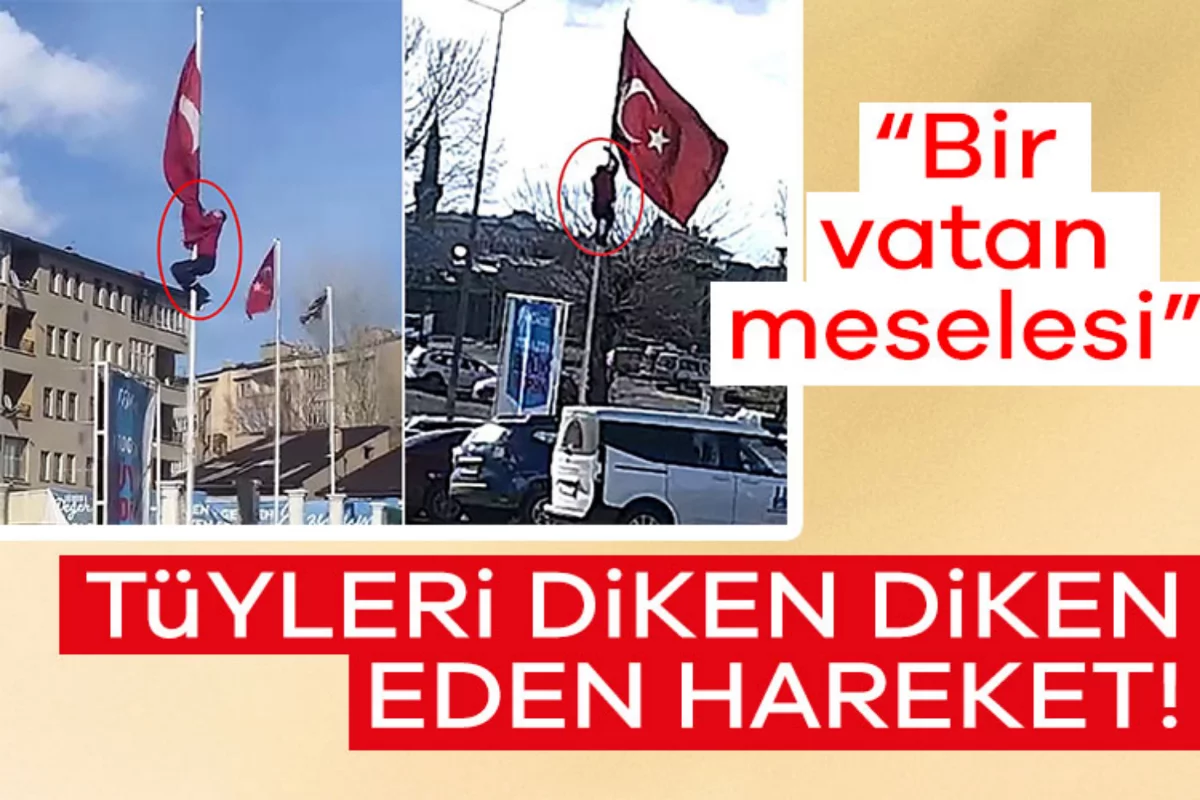 Erzurum'da akaryakıt istasyonunda çalışan Doğuş Güngör, rüzgar nedeniyle direğe dolanan Türk bayrağını düzeltmek için 15 metrelik direğe tırmandı. O anlar sosyal medyada büyük ilgi görürken, Güngör yaptığı hareketi "Bu bir vatan meselesi" sözleriyle anlattı.