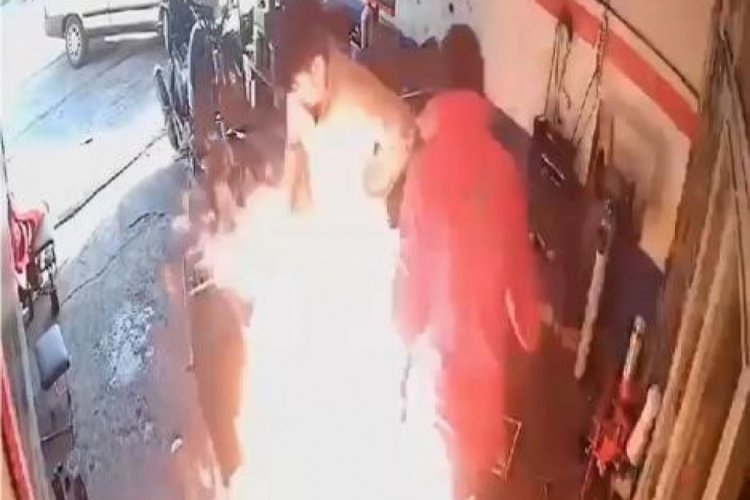 Elazığ'da tamir sırasında bir motosiklette çıkan yangına su yerine şişedeki yanıcı maddeyle müdahale eden 2 kişi bir anda alevlerin arasında kaldı. Şahıslar olayı yara almadan atlatırken, olay anı güvenlik kamerasına yansıdı.