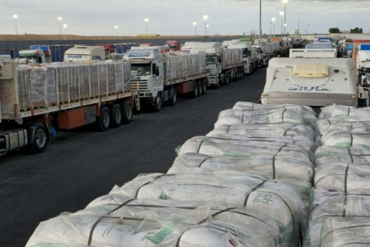 Kamyonlar, bölge halkına dağıtılacak yeni gıda yardımlarını teslim almak üzere yola çıktı.