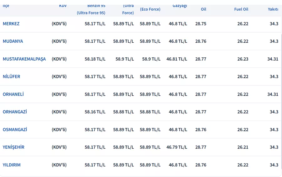 BURSA GÜNCEL AKARYAKIT FİYATLARI