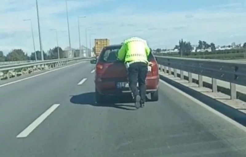 Bölgede görev yapan trafik polisi, hem yol güvenliğini sağladı hem de arızalanan aracı iterek üst geçidin sonuna kadar götürdü. Böylece araç, trafiği tehlikeye düşürmeyecek bir noktaya ulaştırıldı.