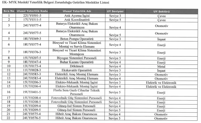 Yayımlanan tebliğe göre, Meslekî Yeterlilik Kurumu (MYK) tarafından standardı belirlenmiş ve ekli listede yer alan mesleklerde çalışanların, MYK Meslekî Yeterlilik Belgesi'ne sahip olmaları zorunlu olacak.