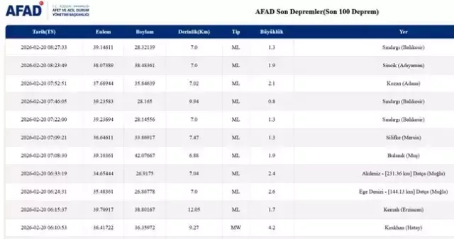 AFAD'ın 20 Şubat 2026 tarihli güncel deprem tablolarında; meydana gelen sarsıntıların merkez üssü, büyüklüğü, derinliği ve gerçekleşme saatine ilişkin ayrıntılı bilgiler yer alıyor.