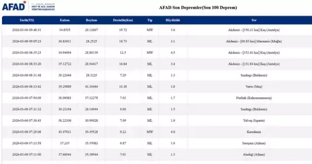 AFAD'ın 6 Mart 2026 tarihli güncel deprem tablolarında, meydana gelen sarsıntıların merkez üssü, büyüklüğü, derinliği ve gerçekleşme saatine dair detaylı bilgiler paylaşılıyor.