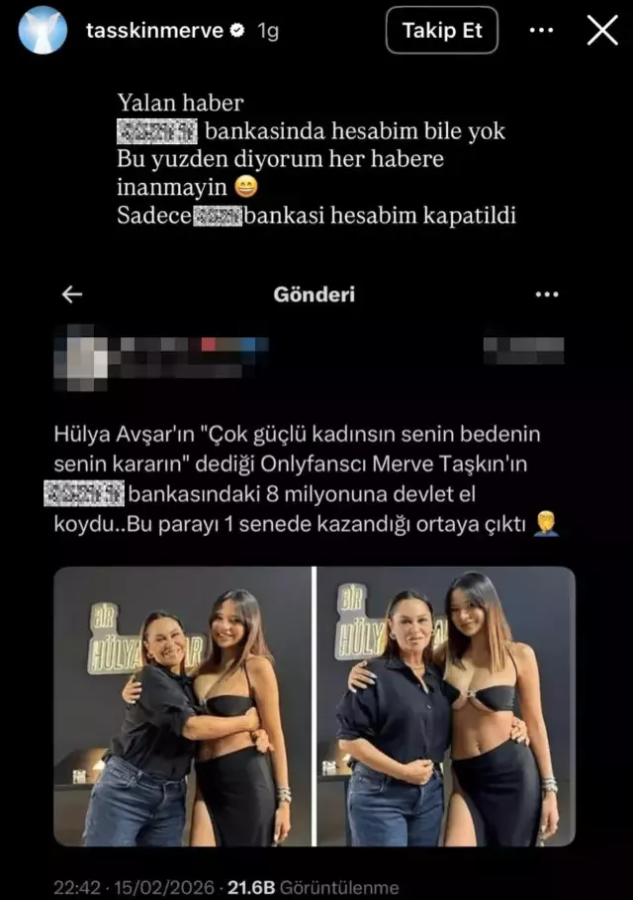 Söz konusu haberi sosyal medya hesabından paylaşan Merve Taşkın, iddiaları yalanladı. Taşkın, "O bankada hesabım bile yok. Sadece ... bankasındaki hesabım kapatıldı" ifadelerini kullandı.