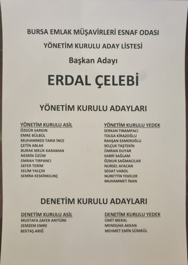 Bursa Bölge, 2026.01.10 19:57Bursa Emlak Müşavirleri Odası 7. Olağan Genel Kurulu'nda sonuçlar belli oldu. Erdal Çelebi, 343 oyla yeniden başkan seçilerek güven tazeledi.