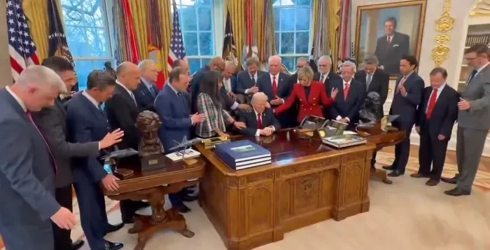 Dünya, 2026.03.06 00:20ABD-Beyaz Saray'da, Trump'a ve ABD'ye dualar edildi. Kameralar tarafından kayıt altına alınan o anlar sosyal medyada çok konuşuldu.