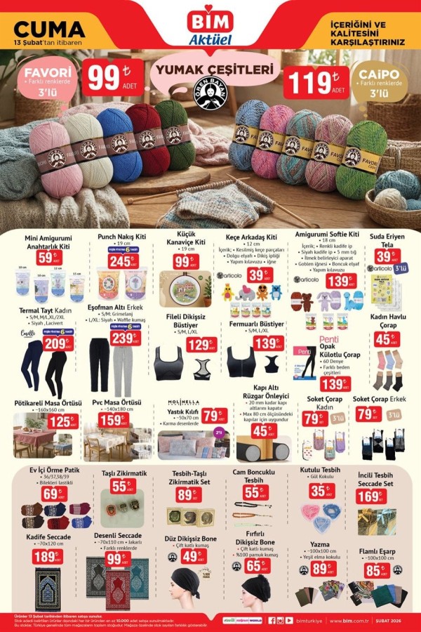 Yaşam, 2026.02.05 11:42BİM, 13 Şubat 2026 tarihli yeni aktüel ürünler kataloğunu yayımladı. Haftanın dikkat çeken indirimlerini ve kampanyalı ürünlerini içeren katalogda, birçok kategoride avantajlı fiyatlar öne çıkıyor. İşte BİM 13 Şubat aktüel katalog...
