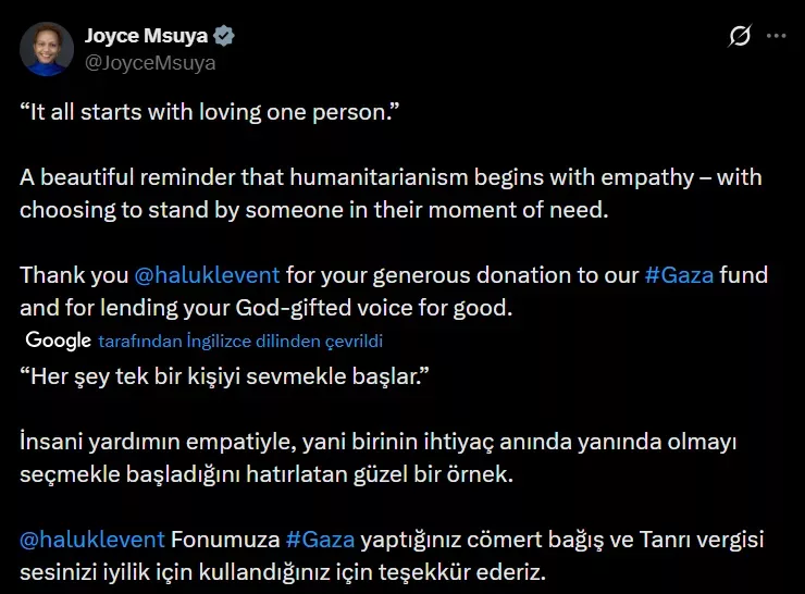Ziyaretin ardından Msuya, X hesabından görüşmeye dair videolu bir paylaşım yaptı. Videoda, Levent'in ziyaretinde yaşanan anlara ait görüntüler yer aldı. Paylaşım metninde ise Msuya, şu ifadelere yer verdi: "'Her şey tek bir kişiyi sevmekle başlar.' İnsani yardımın empatiyle, yani birinin ihtiyaç anında yanında olmayı seçmekle başladığını hatırlatan güzel bir örnek. Cömert bağışınız ve Tanrı vergisi sesinizi iyilik için kullandığınız için teşekkür ederiz @haluklevent