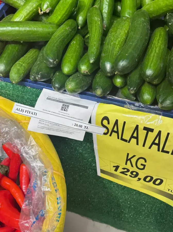 Bir zincir markette satılan salatalığın fiyatı, üretici ile raf arasındaki fark nedeniyle tartışma yarattı. Görüntülenen etikete göre salatalığın kilogram fiyatı 129 TL olarak belirlendi. Aynı ürüne ait üretici alış fiyatının ise 20 TL olduğu belirtildi. Bu durum, ürünün raf fiyatına gelene kadar yaklaşık 5,5 kat arttığını ortaya koydu.