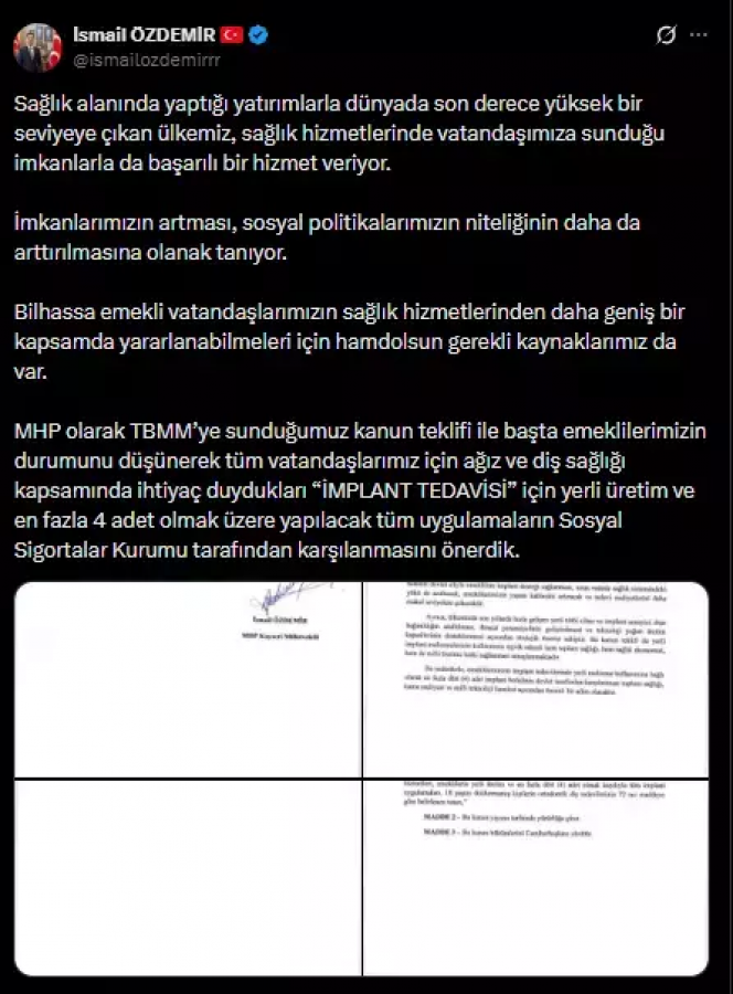 MHP Genel Başkan Yardımcısı ve Kayseri Milletvekili İsmail Özdemir, ağız ve diş sağlığı tedavileriyle ilgili milyonlarca vatandaşı ilgilendiren bir adım attı. Özdemir, implant işlemlerinin Sosyal Sigortalar Kurumu (SGK) tarafından karşılanması için Meclis'e kanun teklifi sundu.