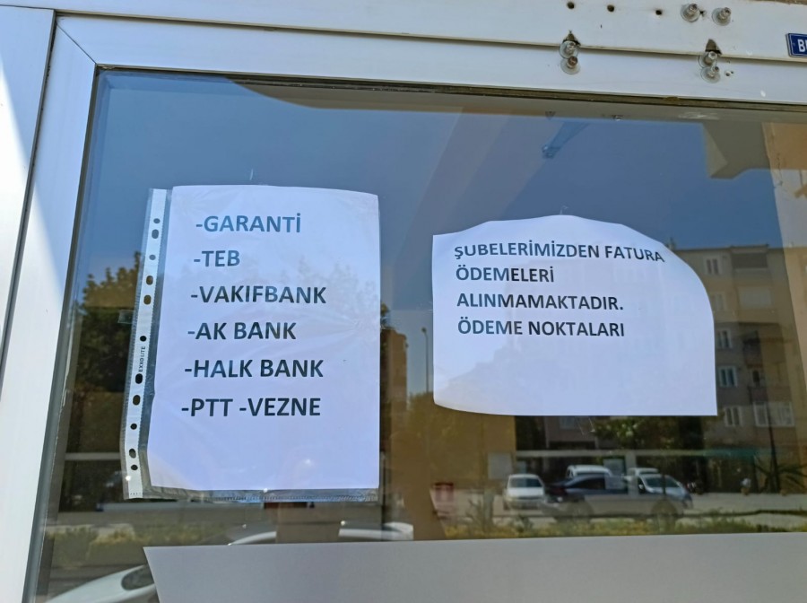 Şimdiye dek işlem merkezinden fatura ödemesi kabul edilen işletmenin camına ise yeni firma yetkilileri tarafından ödemelerin bankadan yapılacağını bildiren uyarı yazısı asıldı.