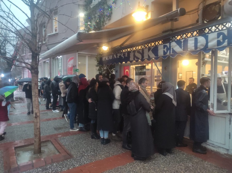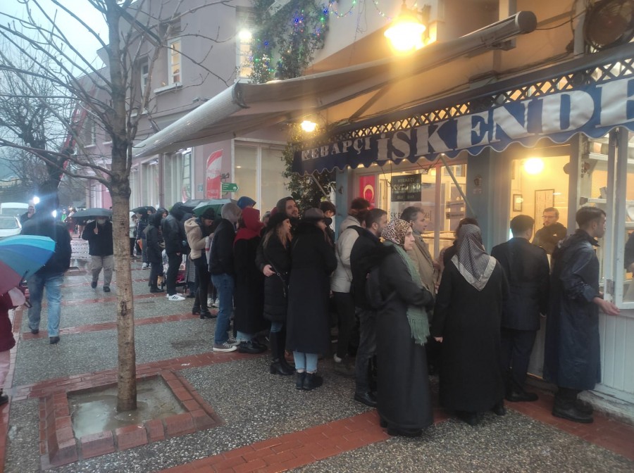 Hafta sonu Bursa'ya gelerek kapalı çarşıdan alışveriş yapan vatandaşlar Bursa Heykel'de bulunan İskender kebap yapan restaurant önünde uzun kuyruklar oluşturdu.