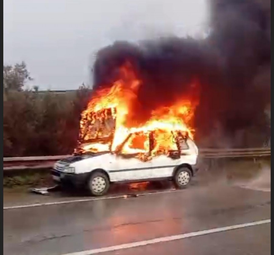 Kazaya karışan otomobil, rapor tutulması için emniyet şeridine çekildikten kısa bir süre sonra bir anda yanmaya başladı. Kısa sürede alev topuna dönen otomobil itfaiye ekipleri tarafından söndürülürken, olayda yaralanan olmadı.