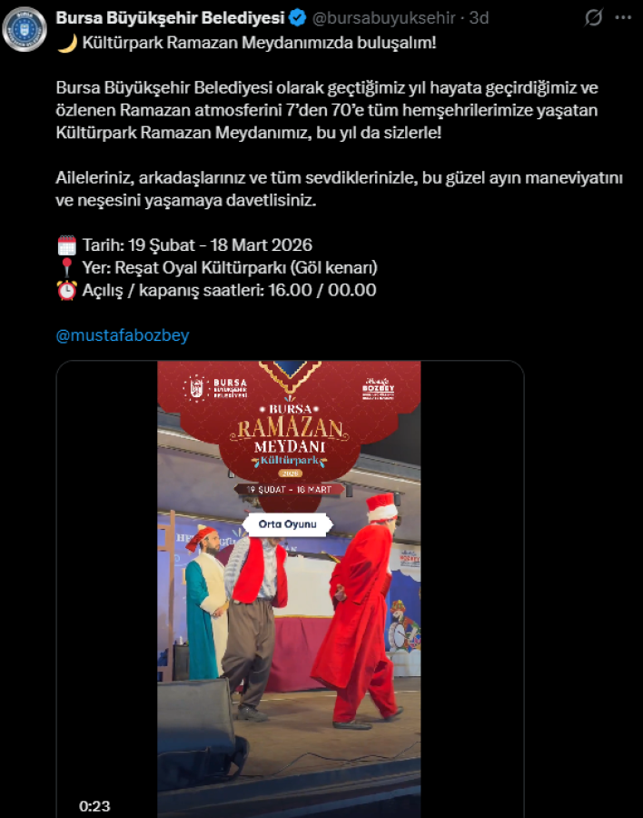 Bursa'da Ramazan ayının geleneksel buluşma noktası haline gelen Kültürpark Ramazan Meydanı, bu yıl da kapılarını açıyor. Bursa Büyükşehir Belediyesi tarafından organize edilen etkinlikler, 19 Şubat - 18 Mart 2026 tarihleri arasında Reşat Oyal Kültürparkı göl kenarında gerçekleştirilecek.
