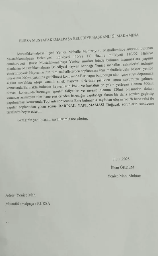 Başvuruda, mülkiyeti Mustafakemalpaşa Belediyesi ve Hazine'ye ait taşınmazlar üzerine yapılması planlanan hayvan barınağının mahalle halkını tedirgin ettiği açıkça belirtildi.
