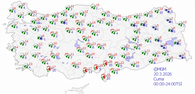 Tahminlere göre ülke genelinde yağışlar çoğunlukla yağmur ve sağanak şeklinde görülecek. Ancak iç kesimlerin yüksek bölgeleri ile Doğu Anadolu'da karla karışık yağmur ve kar yağışı etkili olacak. Meteoroloji, özellikle bazı iller için kar ve kuvvetli sağanak uyarısında bulundu.