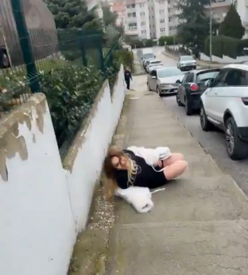 Görüntülerde bir kişinin kaldırım üzerinde aniden yere uzandığı ve farklı hareketler sergilediği anlar yer aldı.