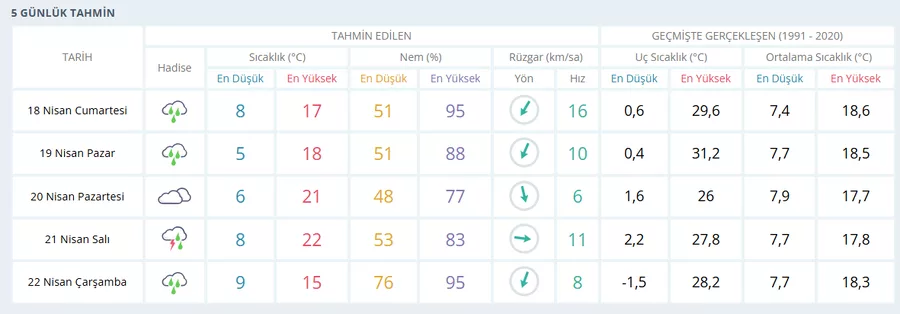 Yeni haftayla birlikte yağışlar yerini parçalı bulutlu bir havaya bırakıyor. Sıcaklıklar artışa geçerek 6 ila 21 derece arasında seyredecek. Nem oranı düşerken (%48 - %77), rüzgar da oldukça hafif esecek (6 km/sa). Haftanın en dengeli günü olarak öne çıkıyor.