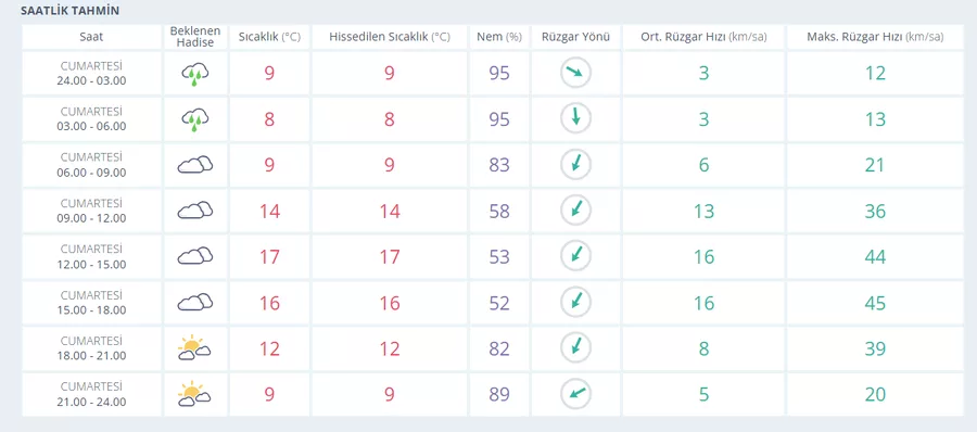 Cumartesi günü gece saatlerinden sabaha kadar yağış etkili olacak. Öğle saatlerine doğru bulutlu hava hakim olurken, sıcaklık 17 dereceye kadar çıkacak. Öğleden sonra rüzgar zaman zaman kuvvetlenerek 40 km/sa üzeri hamleler yapabilir. Akşam saatlerinde ise parçalı bulutlu bir hava bekleniyor.