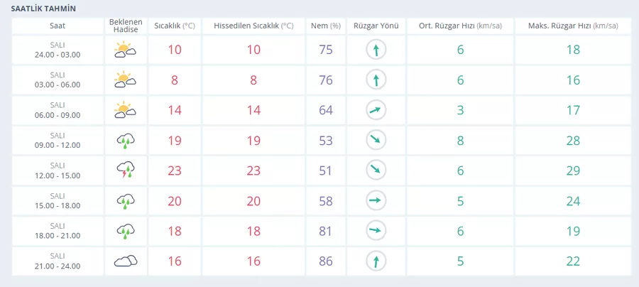 Yağış etkisini artırıyor. Gün boyu aralıklarla sağanak geçişleri görülecek. Sıcaklıklar belirgin şekilde düşerek 10 ila 15 derece aralığında kalacak. Nem oranı %95'e kadar çıkarken, rüzgar zaman zaman 9 km/s hızına ulaşacak.