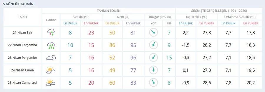 Haftanın ilk gününde gök gürültülü sağanak yağış bekleniyor. Gün içinde sıcaklık 8 ile 23 derece arasında değişecek. Nem oranı %50 ile %81 arasında seyredecek. Rüzgarın ortalama hızı ise 7 km/s civarında olacak. Öğle saatlerinde yağışın yer yer kuvvetli olması bekleniyor.