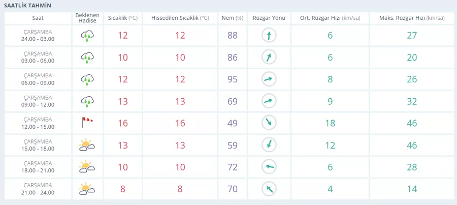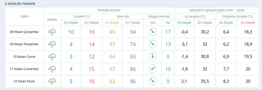 Pazar günü de yağışlı hava devam edecek. En düşük sıcaklık 5°C, en yüksek sıcaklık 16°C. Nem oranı %62 ile %86 arasında ölçülürken, rüzgar 9 km/sa hızında esecek.